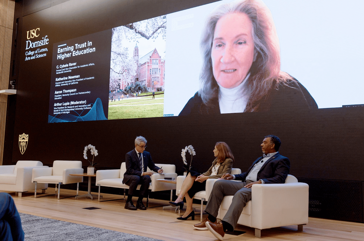 Clockwise from top: Panelists Katherine Newman (Provost and Executive Vice President of Academic Affairs, University of California), Aaron Thompson (President, Kentucky Council on Postsecondary Education), C. Cybele Raver (Provost and Vice Chancellor for Academic Affairs, Vanderbilt), and moderator Arthur Lupia (Vice President for Research and Innovation, University of Michigan) discuss trust in higher education.